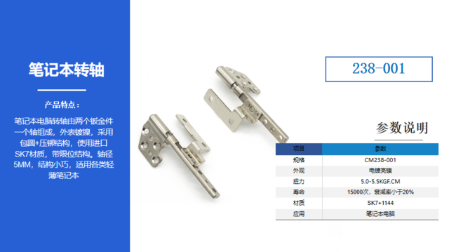 推荐2-经典笔记本转轴238-001,笔记本电脑转轴由两个钣金件一个轴组成,外表镀镍,采用包圆+压铆结构,使用进口SK7材质,带限位结构。轴径5MM,结构小巧,适用各类轻薄笔记本及工业笔记本显示器